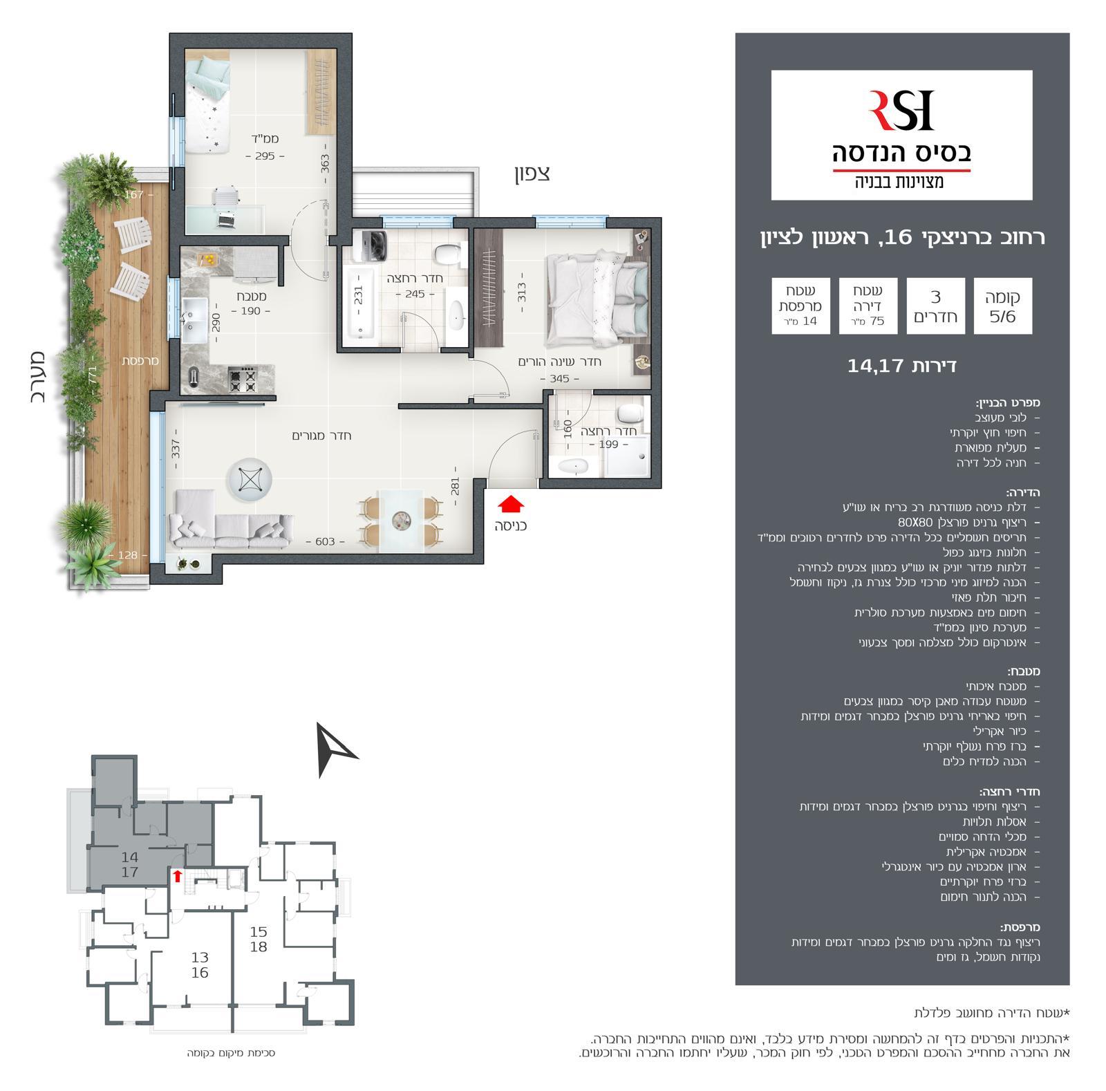 דירת 3 חד’ (14,17) עורפית – קומה 5/6 – 75 מ”ר + 14 מ”ר מרפסת שמש (צפון – מערב) – 2,260,000 ש”ח