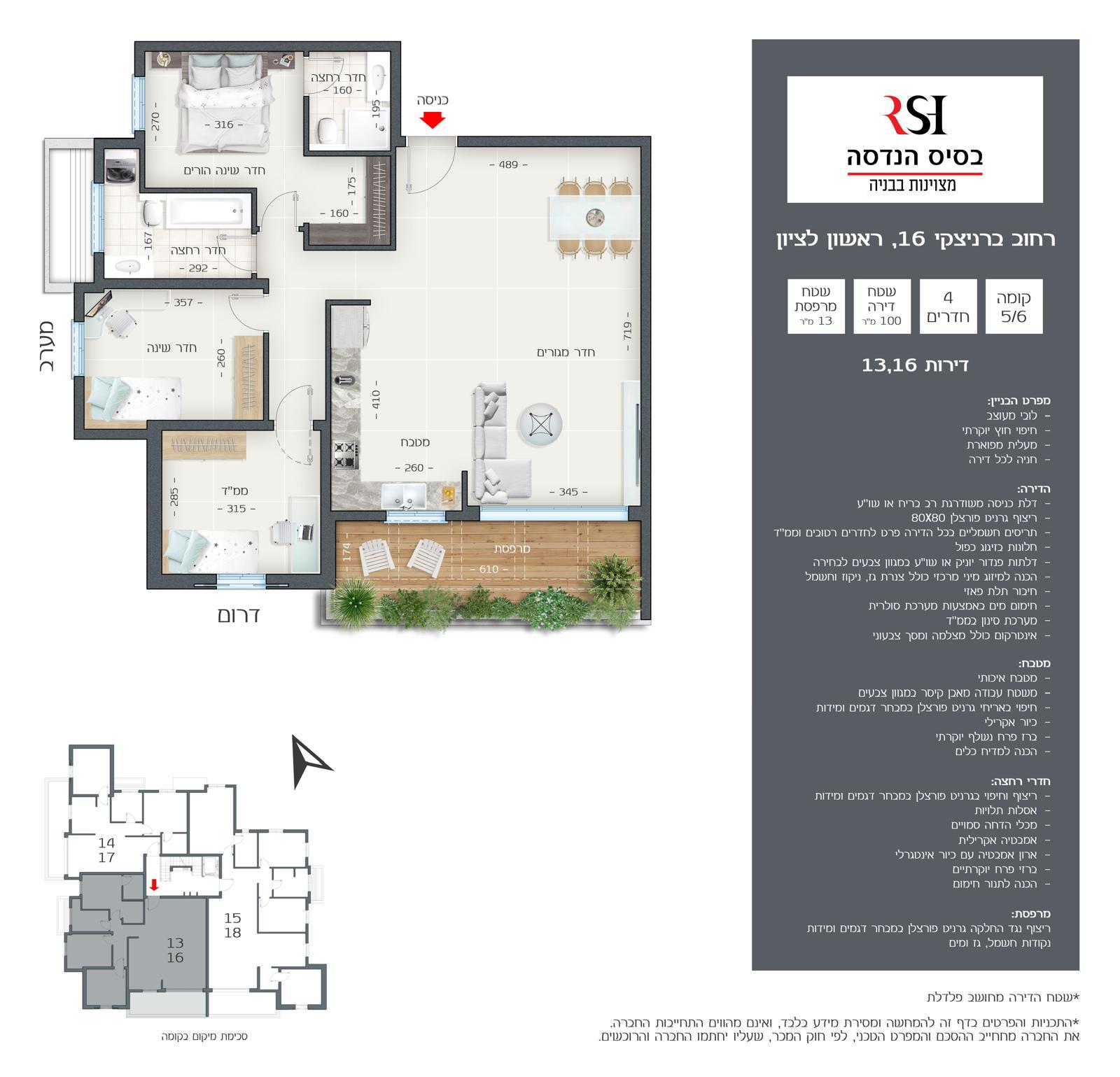 דירת 4 חד’ (13,16) חזיתית – קומה 5/6 – 100 מ”ר + 13 מ”ר מרפסת שמש (דרום – מערב) – 2,670,000 ש”ח