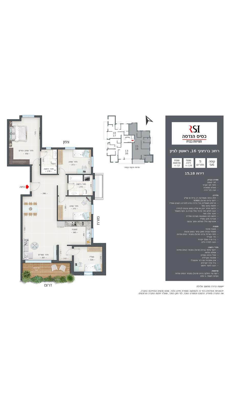 דירת 5 חד’ (15,18) חזיתית – קומה 5/6 – 129 מ”ר + 12 מ”ר מרפסת שמש (דרום – מזרח) – 3,360,000 ש”ח